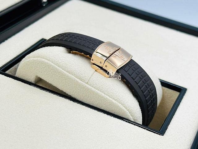 玫瑰金錶殼、錶圈、摺疊帶扣、旋入式錶冠、當地時間校正按鈕 / 黑色原廠橡膠錶帶 / 藍寶石水晶玻璃鏡面 / 透明底蓋