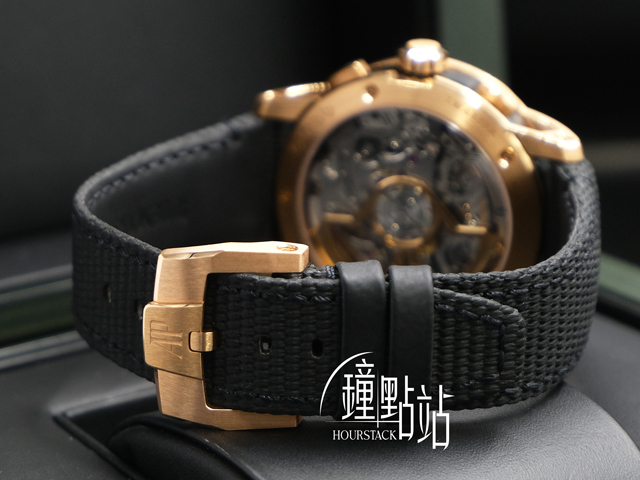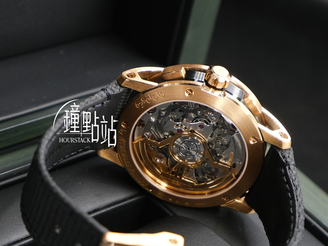 18K玫瑰金+黑色陶瓷錶殼、穿戴針扣、計時按鈕、旋入式錶冠、錶圈 / 藍寶石水晶玻璃鏡面 / 透明底蓋 / 黑色原廠橡膠塗層織紋錶帶
