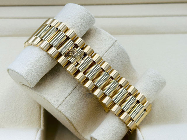 18K黃金錶殼、三角坑紋錶圈、旋入式錶冠、隱藏式摺疊皇冠帶扣、元首型(President)錶帶 / 抗磨損藍寶石水晶玻璃 / 實底蓋
