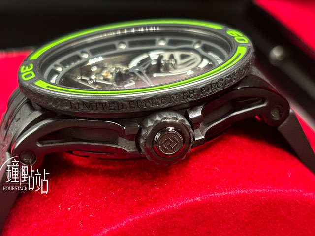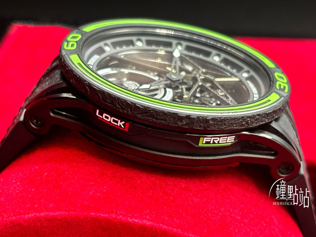 黑色DLC塗層鈦金屬錶殼、分鐘刻度錶圈、橡膠內襯錶冠、三重摺疊扣 / 防眩光藍寶石水晶玻璃 / Pirelli 輪胎橡膠錶帶,附印輪胎紋 |