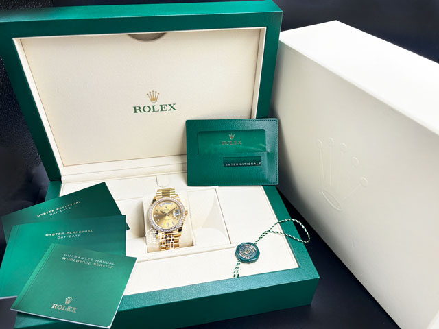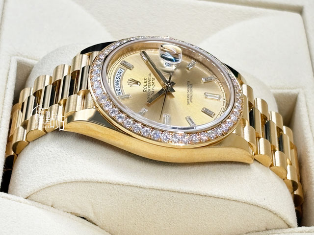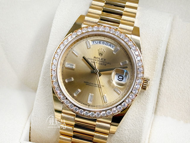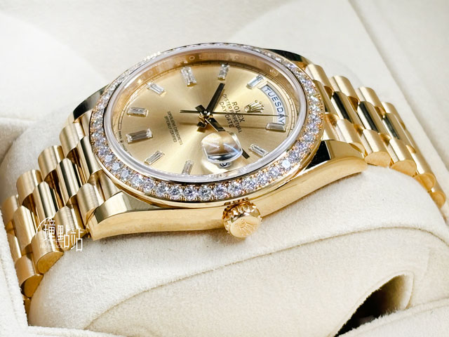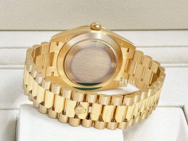 18K黃金錶殼、旋入式錶冠、錶圈、元首型(President)錶帶、隱藏式摺疊皇冠帶扣 / 抗磨損藍寶石水晶玻璃 / 實底蓋 / 原廠鑲嵌49顆鑽石錶圈 |