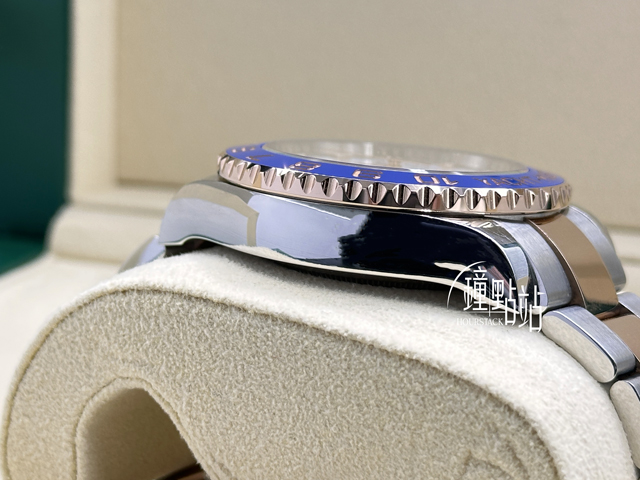 永恆玫瑰金+904L不鏽鋼材質錶殼、錶鍊帶、摺疊帶扣、旋入式錶冠 / Cerachrom藍色陶瓷Ring Command雙向旋轉錶框 / 藍寶石水晶玻璃 / 實底蓋