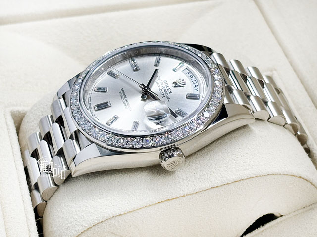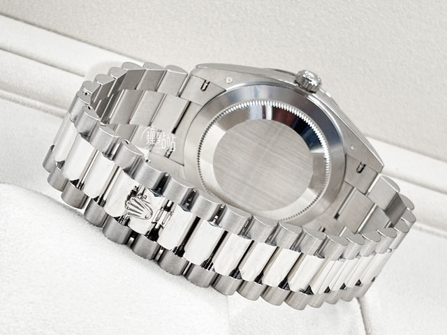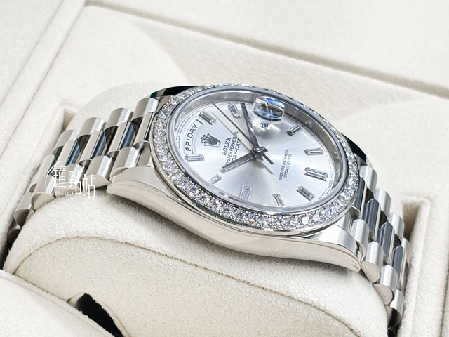18K白金錶殼、旋入式錶冠、錶圈、元首型(President)錶帶、隱藏式摺疊皇冠帶扣 / 抗磨損藍寶石水晶玻璃 / 實底蓋 / 原廠鑲嵌49顆鑽石錶圈 |
