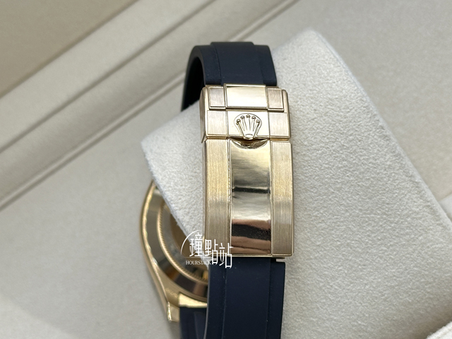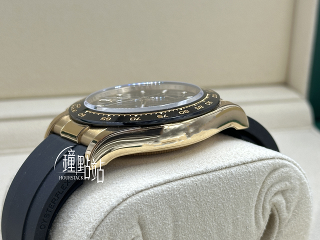 18K黃金錶殼、錶鏈帶、摺疊帶扣、旋入式錶冠、計時按鈕 / Cerachrom黑色陶瓷視距儀刻度錶圈 / 黑色橡膠錶帶 / 藍寶石水晶玻璃鏡面 / 防偽內圈