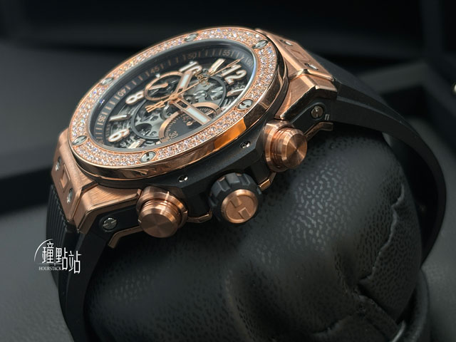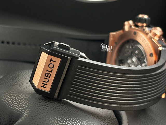 18K皇金(玫瑰金)+黑色鍍層鈦金屬錶殼、摺疊帶扣、上弦錶冠、計時按鈕 / 6顆H形鈦金屬螺絲+原廠鑲嵌126顆鑽石錶圈 / 黑色原廠橡膠錶帶 / 防眩光藍寶石水晶玻璃 / 透明底蓋 |