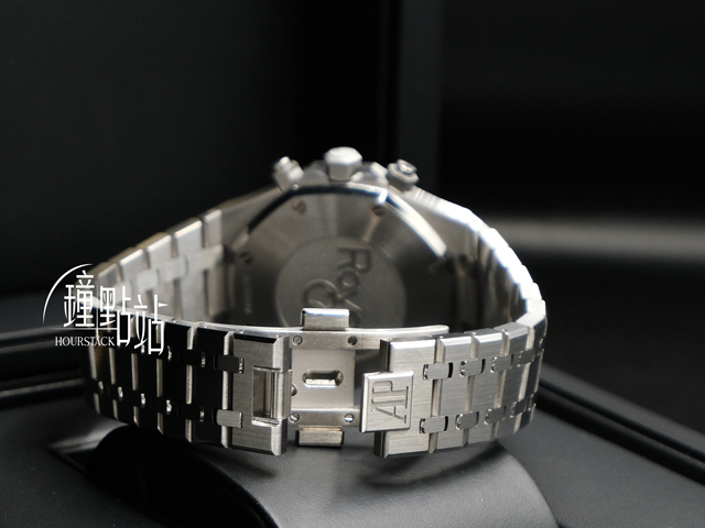不鏽鋼錶殼、錶鍊帶、摺疊帶扣、計時按鈕、旋入式錶冠、皇家橡樹經典螺絲外露八角形錶圈 / 防眩光抗磨損藍寶石水晶玻璃 / 透明底蓋 |