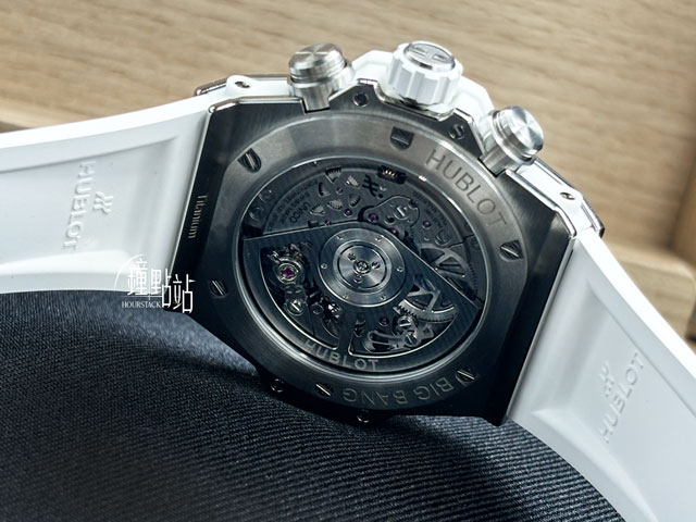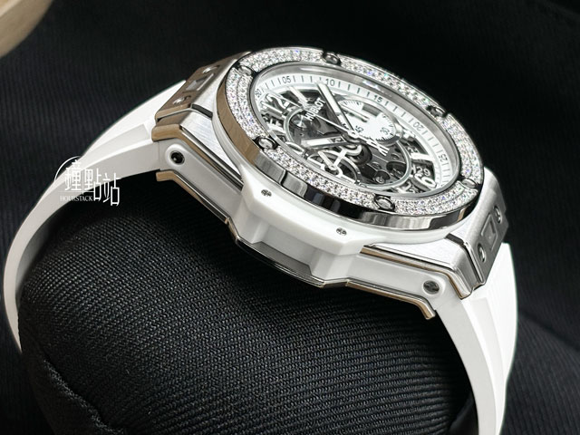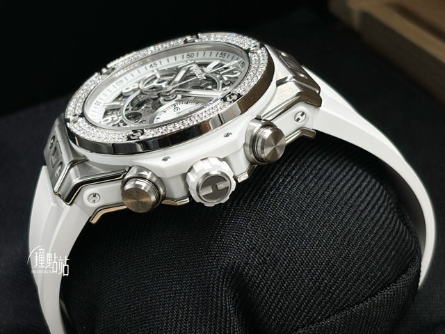 鈦金屬錶殼、摺疊帶扣、上弦錶冠、計時按鈕 / 原廠鑲嵌126顆鑽石錶圈 / 原廠白色橡膠錶帶 / 防眩光藍寶石水晶玻璃 / 透明底蓋
