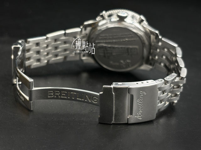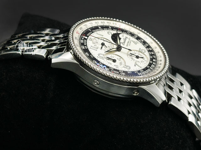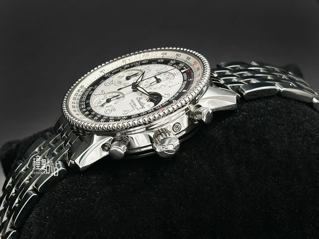 百年靈原廠Caliber19型自動上鏈機械機芯 / 雙向飛行滑尺計算圈 / 月相顯示功能 / 星期、日期顯示盤 / 時、分、小秒針時間指示 / 12點鐘60秒小秒盤 / 計時碼表功能 |
