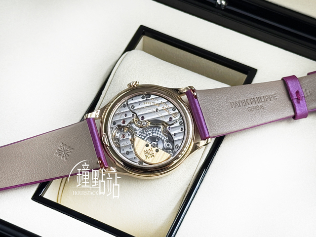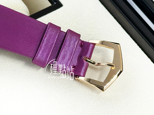 18K玫瑰金錶殼、穿戴針扣、上弦錶冠 / 原廠亮皮紫色小牛皮錶帶 / 藍寶石水晶玻璃鏡面 / 透明底蓋 / 原廠鑲嵌76顆鑽石(0.55克拉)錶圈 / 22K金偏心式迷你自動陀