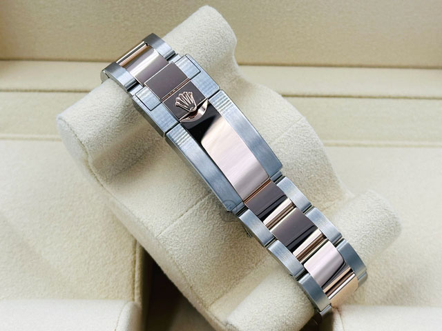 永恒玫瑰金+蠔式鋼錶殼、錶鍊帶、摺疊帶扣、旋入式錶冠 / Cerachrom陶瓷磨砂雙向旋轉錶圈 / 抗磨損藍寶石水晶玻璃 /