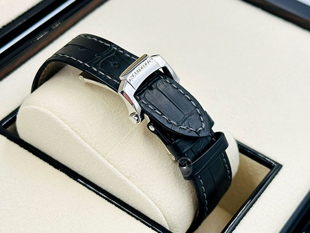 不鏽鋼錶殼、八角形錶圈、專利摺疊扣、旋入式錶冠 / 藍寶石水晶玻璃鏡面 / 透明底蓋 / 原廠黑色鱷魚皮錶帶+原廠藕紫色橡膠錶帶