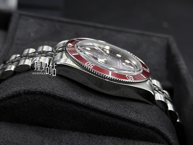 不鏽鋼錶殼、旋入式錶冠、T‑Fit快調式摺疊扣、五格鏈錶帶 / 酒紅色陽極氧化鋁單向旋轉錶圈 / 防眩光藍藍寶石水晶玻璃鏡面 / 實底蓋