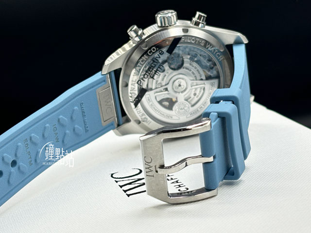 不鏽鋼錶殼、錶圈、旋入式錶冠、穿戴針扣、計時按鈕 / 原廠淺藍色橡膠錶帶 / 雙面防反光凸狀藍寶石玻璃鏡面 / 透明底蓋