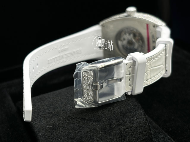 材質: 不鏽鋼錶殼、上弦錶冠 / 原廠手工鑲嵌308顆明亮式切割鑽石(4.44 克拉)錶殼、穿戴針扣 / 粉色原廠外層鱷魚皮內橡膠錶帶 / 藍寶石水晶玻璃鏡面 / 透明底蓋