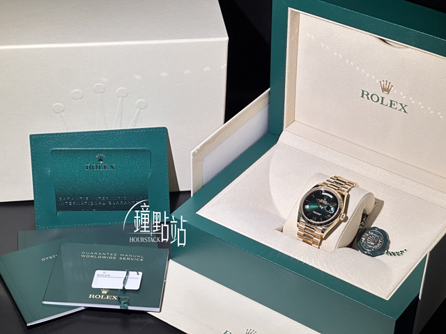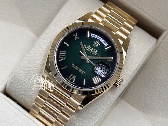 ROLEX 勞力士 Oyster Day-Date 36 星期日曆型 128238 煙燻綠面盤  蠔式 18K黃金 元首型錶鍊帶 2025年新式保卡 星期窗 日期窗 大三針 自動上鍊 36mm 誠摯邀請各位錶迷攜帶 AP、PP、Rolex 等名錶來店交換!本店承諾以最高價格評估,誠信交易,歡迎洽詢。