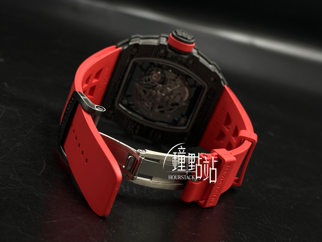 碳纖維錶殼、摺疊帶扣、五級鈦合金花鍵螺絲設計錶圈 / Alcryn®橡膠輪胎型錶冠 / 專利可變幾何結構自動盤 / 原廠紅色橡膠皮錶帶 / 防眩光藍寶石水晶玻璃 / 透明底蓋 |