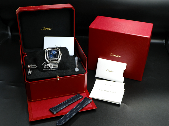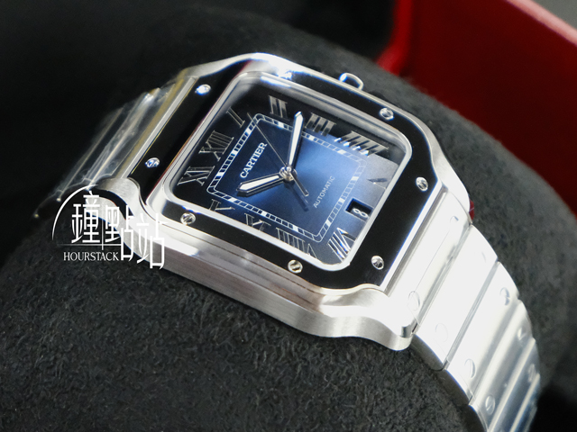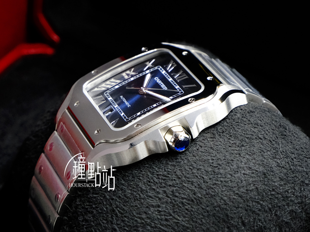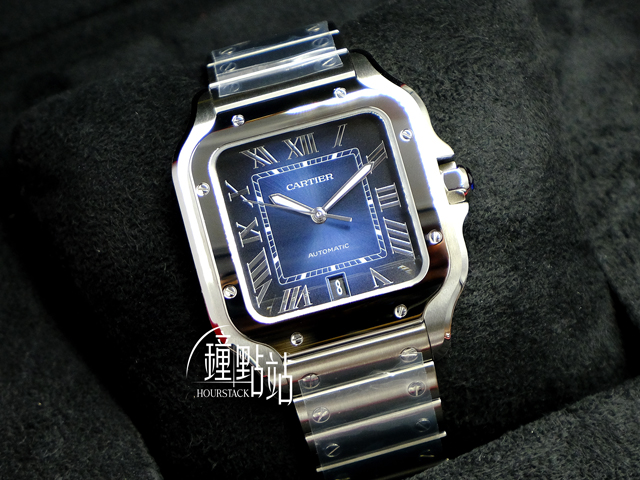CARTIER 卡地亞  SANTOS DE CARITER 山度士 WSSA0071 經典方形設計 大型款 精鋼 2025年保卡 附藍色鱷魚皮錶帶 動力儲存40小時 大三針 羅馬時標 QuickSwitch互換式系統 防水深度100米 自動上鍊 39.8mm