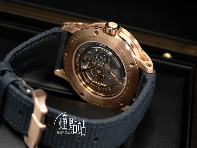 18K玫瑰金錶殼、錶圈、旋入式錶冠、摺疊式針扣 / 深藍編織橡膠錶帶 / 藍色內錶圈 / 抗磨損藍寶石水晶玻璃 / 透明底蓋 |