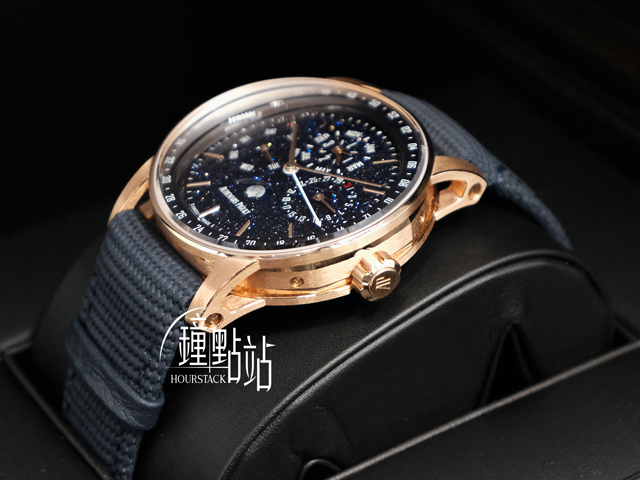 以18K玫瑰金錶殼 搭配深藍星辰玻璃面盤,宛如將浩瀚星河戴上手腕。