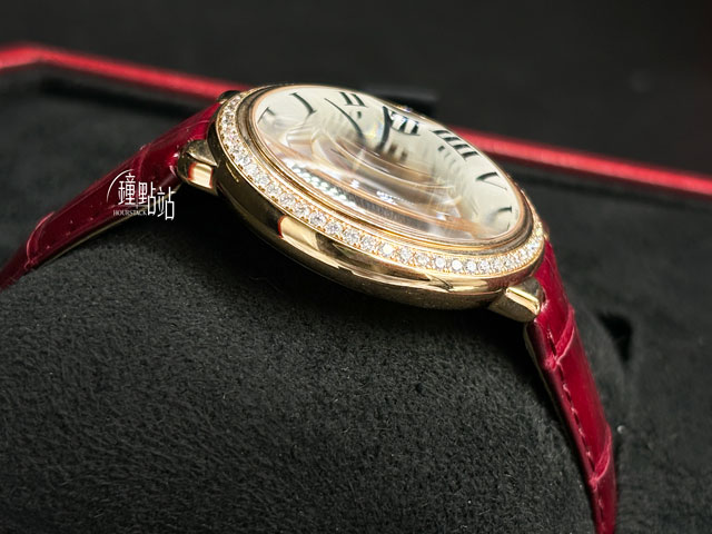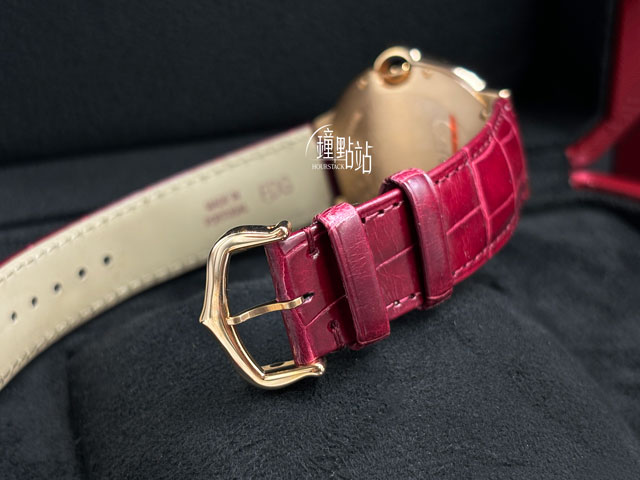 750/1000玫瑰金錶殼、凹槽式圓形藍寶石錶冠、雙重摺疊扣 / 原廠鑲嵌54顆鑽石(約0.79ct)錶圈 / 原廠酒紅色鱷魚皮錶帶 / 抗磨損藍寶石水晶鏡面 / 實底蓋