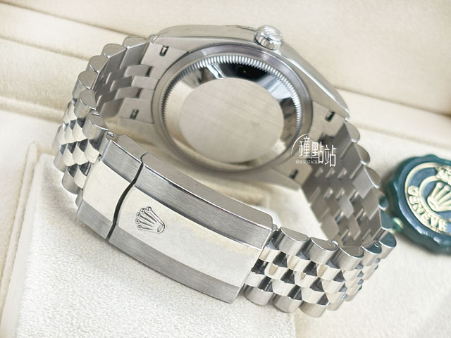 904L精鋼+18K白金錶殼、摺疊帶扣、旋入式錶冠、三角坑紋錶圈、紀念型(Jubilee)五株錶帶 / 防眩光藍寶石水晶玻璃 / 實底蓋